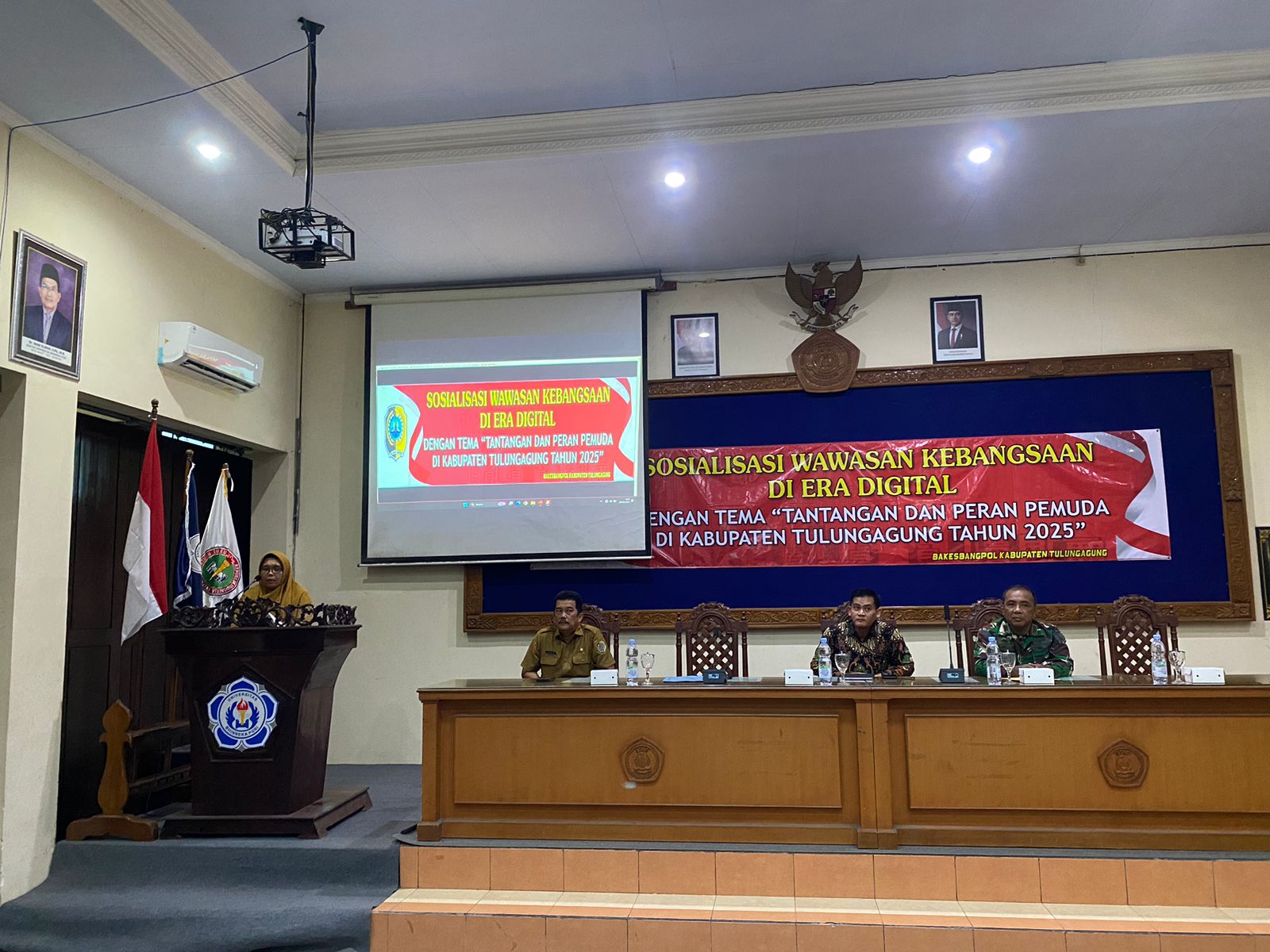 bharindo.co.id Tulungagung, Senin 29 September 2025 — Badan Kesatuan Bangsa dan Politik (Bakesbangpol) Kabupaten Tulungagung menyelenggarakan kegiatan Sosialisasi Wawasan Kebangsaan dengan tema “Tantangan dan Peran Pemuda di Era Digital”. Kegiatan ini bertempat di Auditorium UBHI Tulungagung dan dimulai pukul 09.00 WIB.