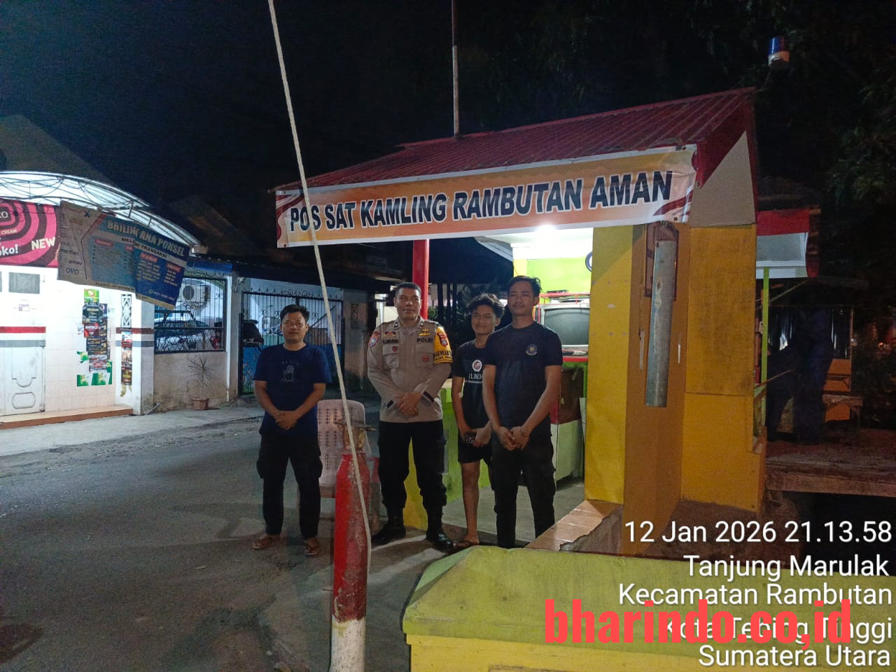 bharindo.co.id Tebing Tinggi,- Bhabinkamtibmas Polsek Rambutan Polres Tebing Tinggi Aiptu H Hutapea dan Aipda Alimudin melakukan sambang dan pengecekan sekaligus menyampaikan pesan kamtibmas dalam rangka menjaga keamanan dan ketertiban masyarakat yang berlangsung di Pos Sat Kamling Merah Putih, Kelurahan Tanjung Marulak Kecamatan Rambutan Kota Tebing Tinggi, Senin malam (12/1/2026).