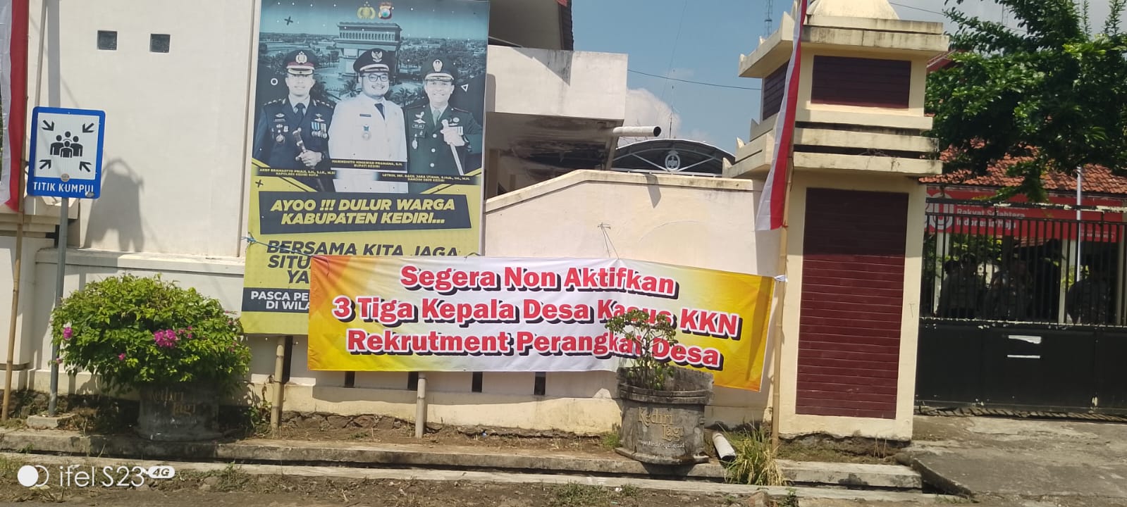 Aksi tersebut digelar oleh LSM Rekan Indonesia dengan koordinator lapangan (Korlap) Bagus Romadhon dan Gerakan Pemberdayaan Masyarakat Swadaya Hidup Sejahtera (Swahira) dengan Korlap Arif Fatikunadi. Dalam orasinya, massa menegaskan agar Kapolda Jatim segera mengeluarkan surat penetapan tersangka kepada tiga kepala desa dan mendesak Pemerintah Kabupaten Kediri untuk segera menonaktifkan mereka dari jabatan.