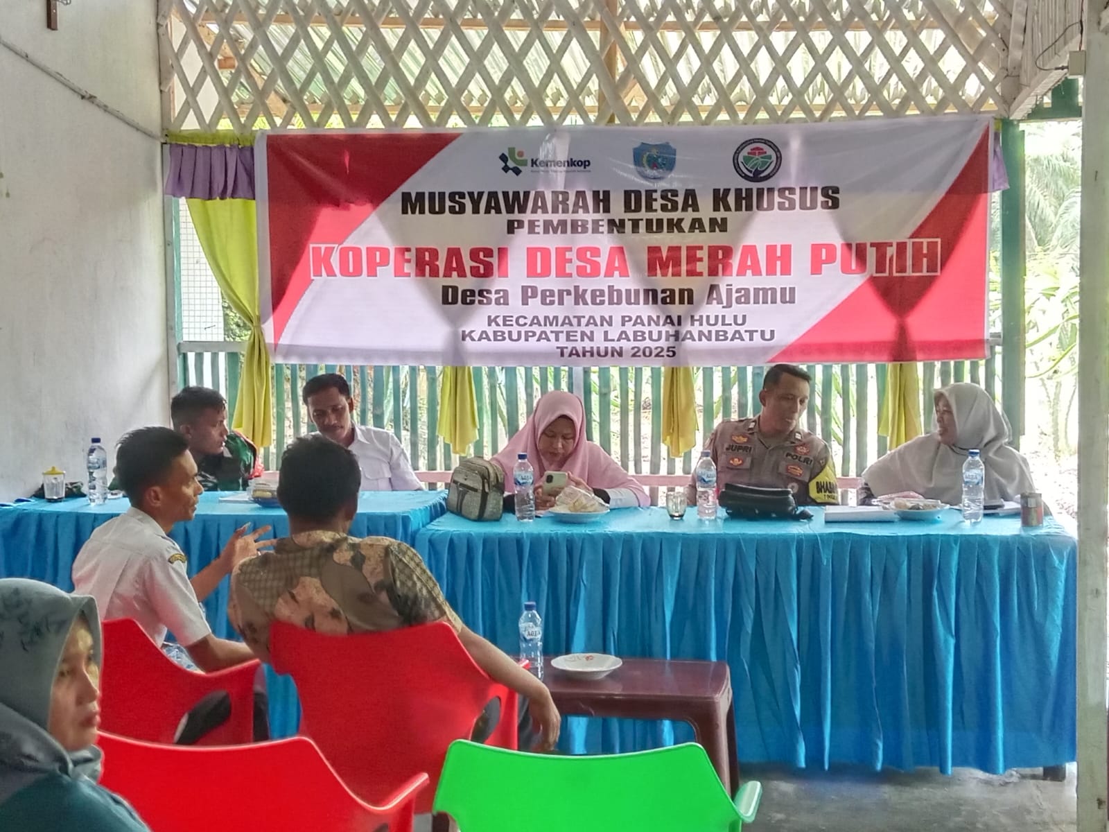 Pembentukan Koperasi Desa Merah Putih di Desa Perkebunan Ajamu di hadiri, Kepala Desa Perkebunan Ajamu Wahidin, perwakilan dari Kecamatan Panai Hulu Irmayani , Pendamping Desa Leni Situmorang serta Bhabinkamtibmas Polsek Panai Tengah Aiptu Jupriadi dan Babinsa Koramil 04 Panai TengahTengah Serda M. Hutasoit beserta aparatur Desa juga masyarakat dan Badan Permusyawaratan Desa (BPD).