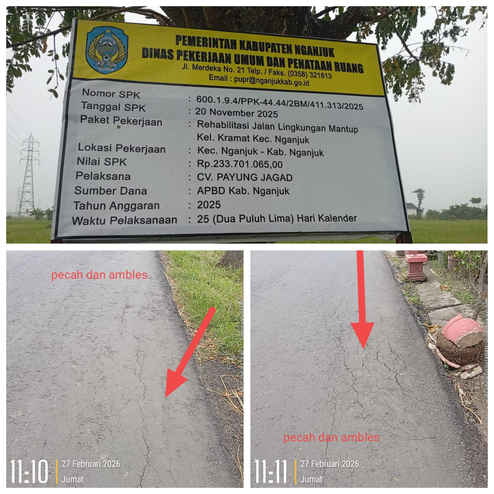 Papan proyek menunjukkan kalau proyek tersebut memakai APBD TA 2025 dengan nilai anggaran Rp 233.701.065.00 dengan pelaksana CV Payung Jagad, Nomor SPK 600.1.9.4/PPK-44/2BM/411.313/2025 dengan waktu pelaksanaan 25 hari kalender.