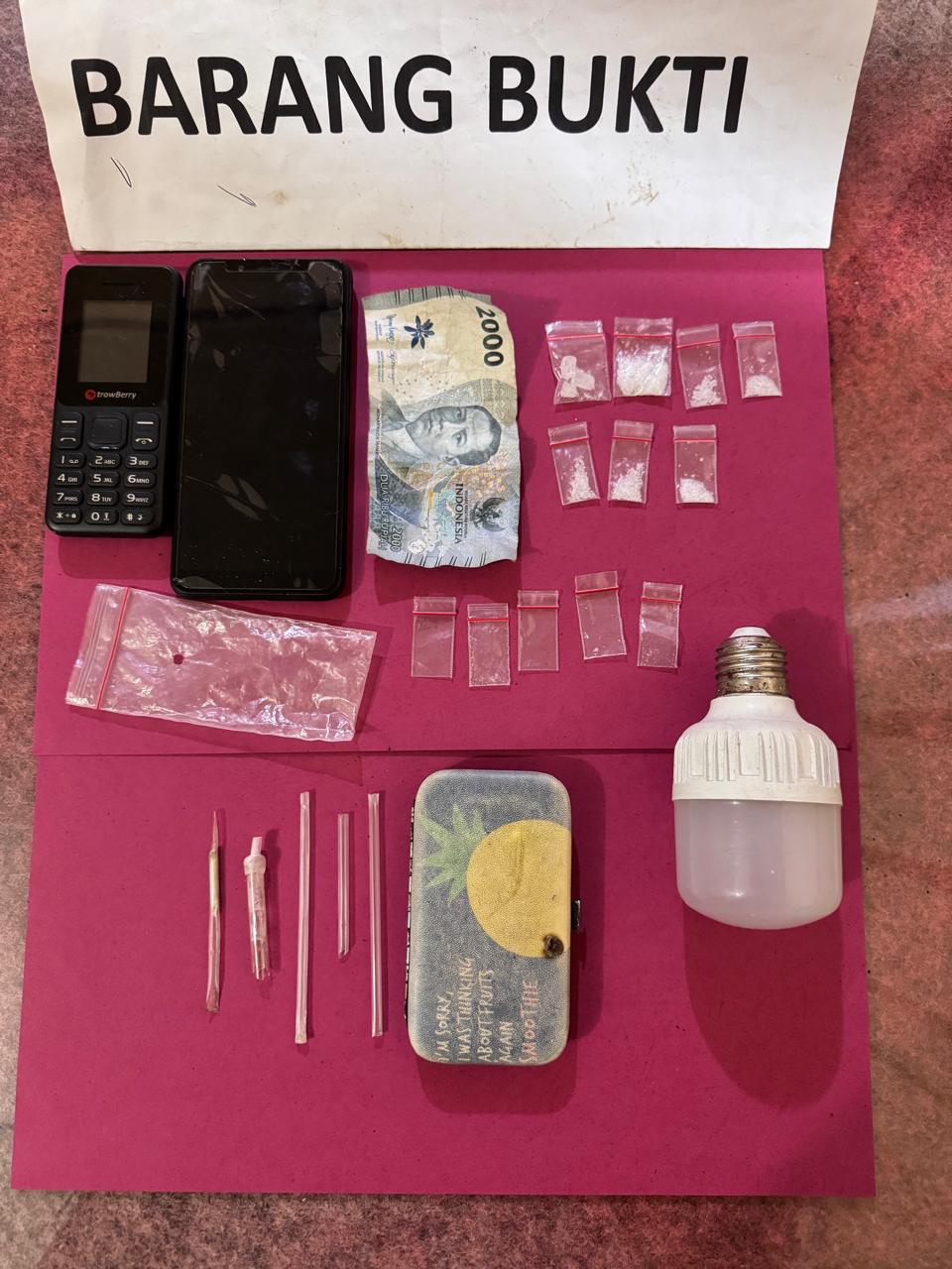 Dari pengungkapan ini, petugas berhasil menyita barang bukti berupa tujuh bungkus plastik klip transparan berisi sabu dengan total berat bruto 1,88 gram, lima bungkus plastik klip kecil kosong, satu lembar uang pecahan Rp2.000,-, satu plastik klip besar kosong, dua unit handphone, satu buah pipet kecil berbentuk sekop, tiga buah pipet kecil, satu buah kaca pirex bekas bakar, satu kotak kecil warna biru muda, satu bola lampu warna putih, serta satu unit sepeda motor Honda Vario warna merah dengan nomor polisi BK 6367 RPG.