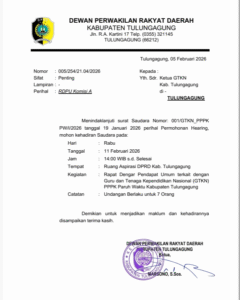 Belum reda isu gugatan, manuver berikutnya muncul melalui PGRI Tulungagung dengan agenda Rapat Dengar Pendapat Umum (RDPU) bersama Komisi A DPRD Kabupaten Tulungagung. Agenda yang digelar Rabu, 11 Februari 2026 itu mengangkat isu panas kesejahteraan PPPK paruh waktu, realisasi tunjangan fungsional, implementasi TAPERA, hingga pembayaran TPG dan gaji ke-13 guru ASN.