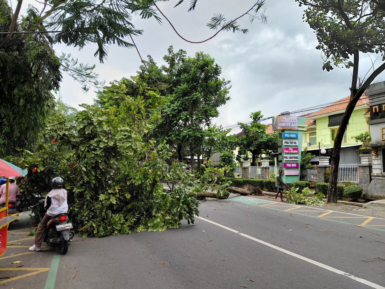 Pohon berukuran besar tersebut roboh akibat terpaan hujan deras disertai angin, sehingga sempat mengganggu arus lalu lintas di kawasan tersebut. Situasi berpotensi membahayakan pengguna jalan yang melintas.