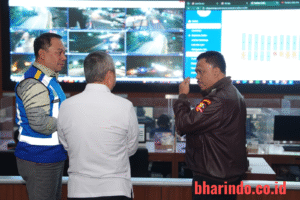 bharindo.co.id Jakarta,— Kepala Korps Lalu Lintas (Kakorlantas) Polri Irjen Pol. Agus Suryonugroho bersama Menteri Perhubungan Dudy Purwagandhi dan Direktur Utama PT Jasa Marga (Persero) Tbk Rivan A. Purwantono melakukan pemantauan kondisi arus lalu lintas di sejumlah ruas jalan tol. Pemantauan dilakukan melalui Ruang Planar Lantai II Gedung NTMC Korlantas Polri, Selasa (23/12/2025).