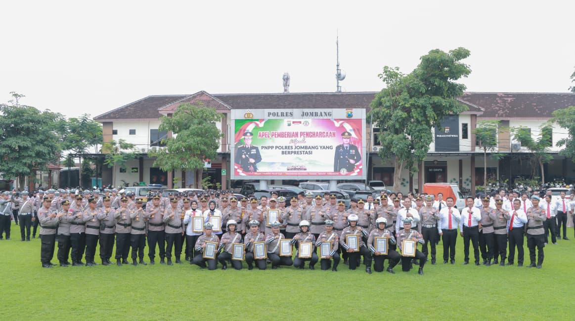 bharindo.co.id Jombang,- Kapolres Jombang AKBP Ardi Kurniawan, S.H., S.I.K., CPHR memberikan penghargaan kepada 15 personel berprestasi atas dedikasi dan kinerja di satuan masing-masing dalam mendukung pelaksanaan tugas Kepolisian Negara Republik Indonesia (Polri), khususnya di lingkungan Polres Jombang. Kegiatan tersebut dilaksanakan di lapangan Mapolres Jombang pada Selasa (24/2/2024).