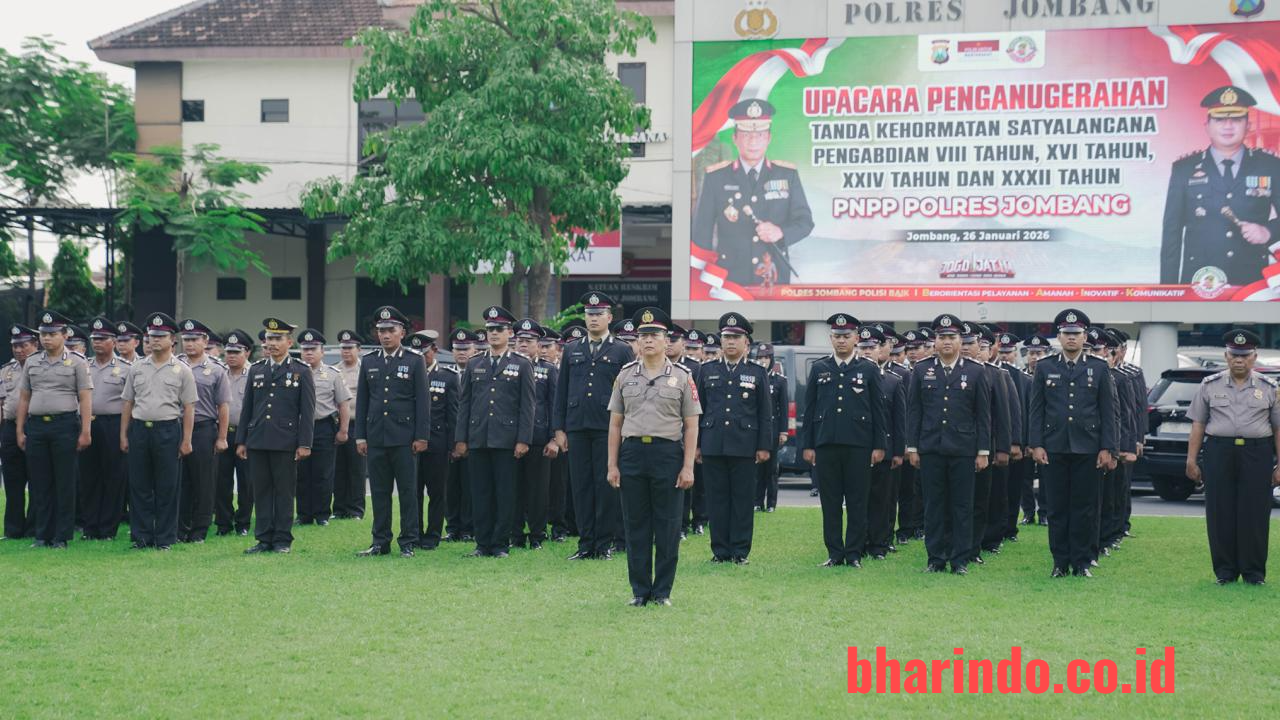 bharindo.co.id Jombang,- Kepolisian Resor (Polres) Jombang menggelar upacara penganugerahan Tanda Kehormatan Satyalancana Pengabdian kepada personel Polri yang telah menunjukkan dedikasi, loyalitas, serta pengabdian dalam pelaksanaan tugas kepolisian, Senin (26/1/2026).
