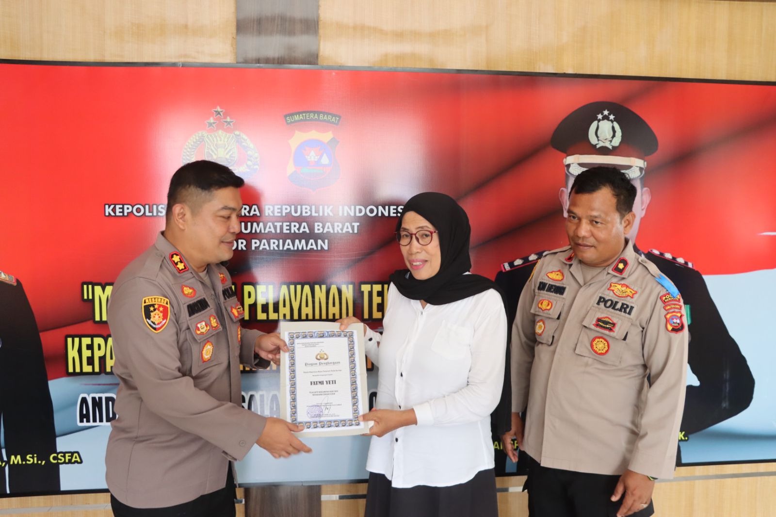 bharindo.co.id Pariaman,— Kapolres Pariaman, AKBP Andreanaldo Ademi, S.H., S.I.K., memberikan penghargaan kepada Ibu Fatmi Yeti, atau yang lebih dikenal sebagai Teta Sabar, seorang perempuan yang selama hampir 20 tahun aktif menjadi penggerak dan pendamping bagi korban tindak asusila serta anak-anak yang berhadapan dengan hukum di wilayah Kota Pariaman. Penghargaan diserahkan pada Selasa (18/11/2025).