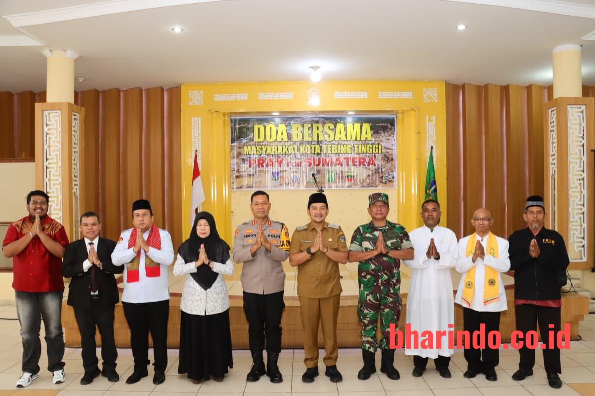bharindo.co.id Tebing Tinggi,- Kapolres Tebing Tinggi AKBP Drs Simon Paulus Sinulingga, SH dan Wali Kota Tebing Tinggi H Iman Irdian Saragih, SE bersama Forkopimda menggelar doa bersama “Pray Sumatera” sebagai bentuk empati atas bencana yang melanda pulau Sumatera. Kegiatan ini berlangsung pada Senin (29/12/2025) bertempat di Gedung Hj Sawiyah Jalan Sutomo Kota Tebing Tinggi.