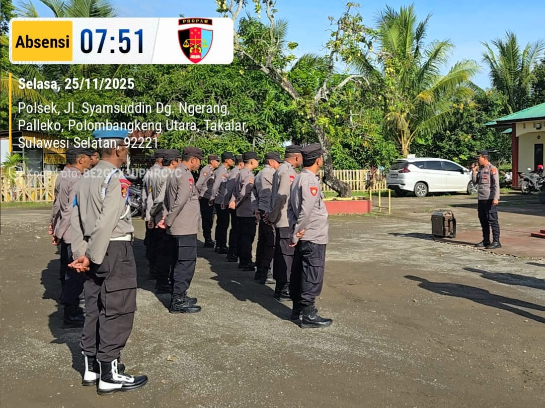 bharindo.co.id Takalar.- Suasana pagi di halaman Mapolsek Polombangkeng Utara Polres Takalar berjalan khidmat saat seluruh personel mengikuti apel pagi pada Selasa, 25 November 2025 pukul 07.30 WITA. Apel dipimpin langsung oleh Kapolsek Polombangkeng Utara , IPTU Muh. Faisal Akbar, dan dihadiri oleh Wakapolsek, Para Kanit, Ka. Sium, serta seluruh Brigadir Polsek Polombangkeng Utara kab Takalar Provinsi Sulawesi Selatan. .