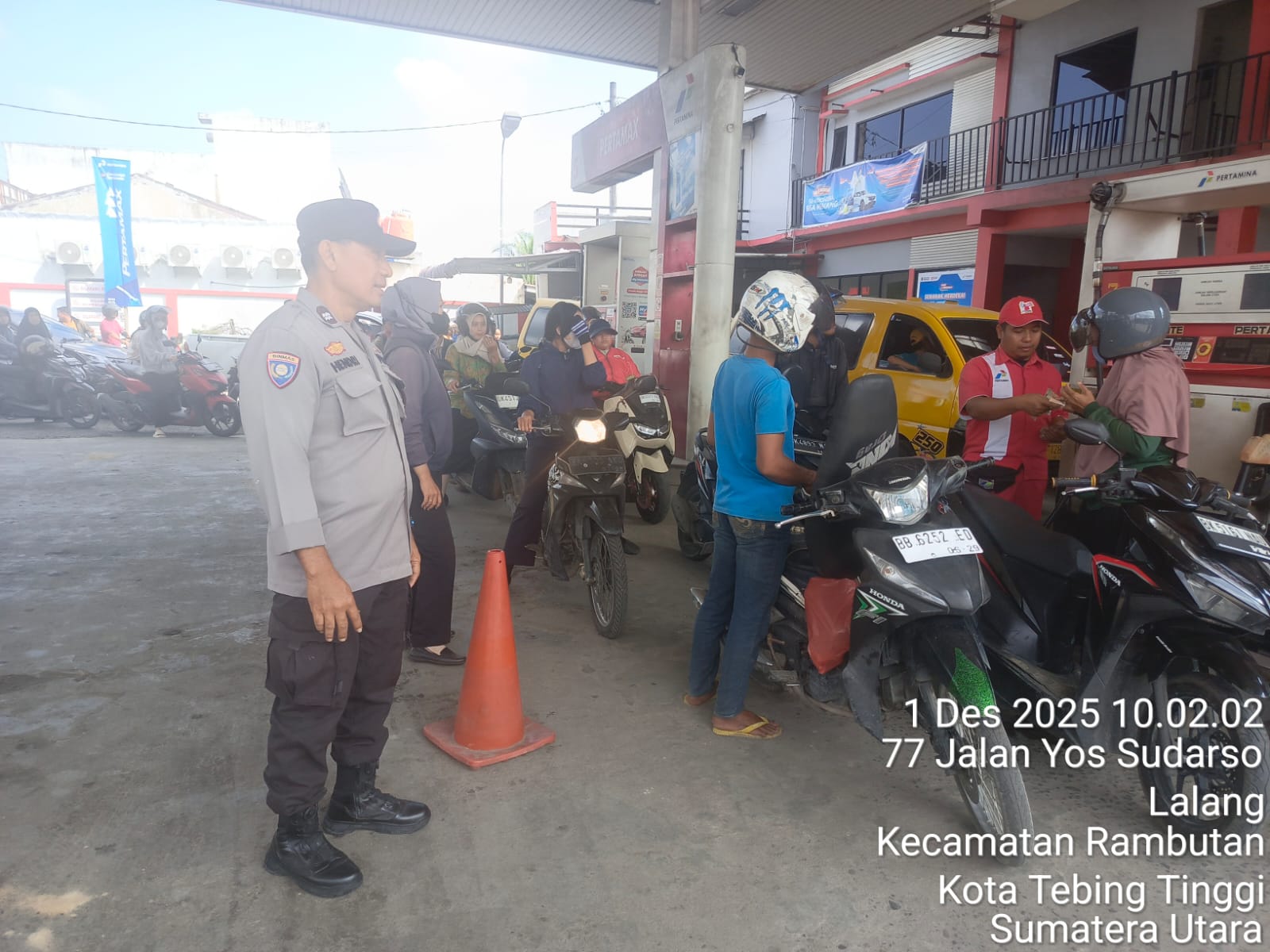 bharindo.co.id Tebing Tinggi,- Bhabinkamtibmas Polsek Rambutan Polres Tebing Tinggi Aiptu HR Hutapea melaksanakan patroli doalogis di SPBU Simpang Beo Jalan Yos Sudarso Kota Tebing Tinggi sekaligus menghimbau masyarakat yang sedang antre untuk pengisian BBM, Senin (1/12/2025).
