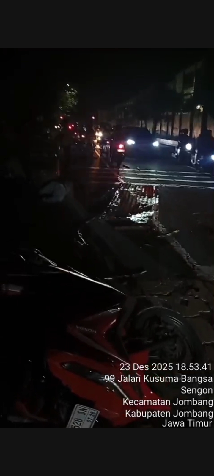 bharindo.co.id Jombang,- Telah terjadi insiden kecelakaan lalu lintas tunggal, seorang pemotor menabrak seng pembatas tumpukan material hingga menyebabkan pemotor tersebut tersungkur jatuh dan tidak sadarkan diri.