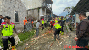 bharindo.co.id Wonosobo,- Pleton Siaga Bhayangkara Polres Wonosobo diterjunkan langsung untuk membantu penanganan dan evakuasi material pascakejadian angin puting beliung yang melanda Dusun Jambon, Desa Sojopuro, Kecamatan Mojotengah, Kabupaten Wonosobo, Selasa, 23 Desember 2025 sore.