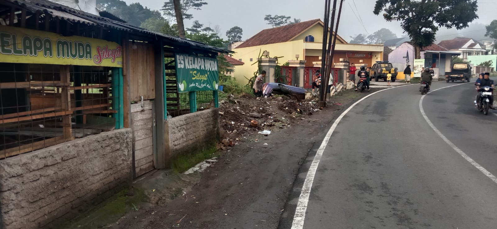 Menurut keterangan yang dihimpun dari saksi di lokasi kejadian, kendaraan tersebut diduga hilang kendali saat melaju dari arah Leuwigoong.