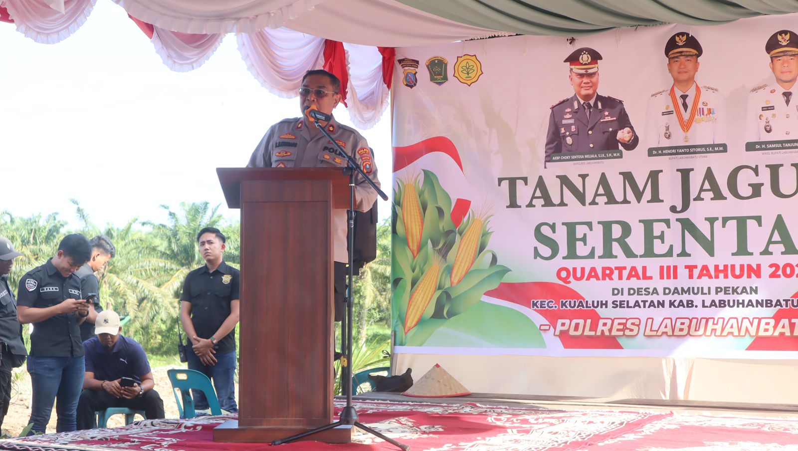 Turut hadir dalam kegiatan ini Wakil Bupati Labuhanbatu Utara Dr. H. Samsul Tj, ST., MH., Unsur Forkopimda Kabupaten Labuhanbatu Utara, MAYOR INF A. Sinaga, SH., mewakili Dandim 0209/LB, para Pejabat Utama (PJU) Polres Labuhanbatu, serta Kelompok Tani Simbot sebagai mitra pelaksana di lapangan.