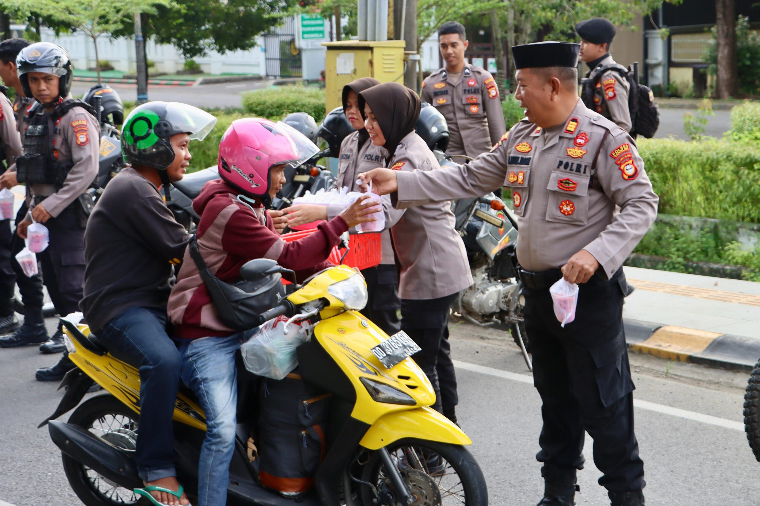 Selain membagikan takjil, personel kepolisian juga mengingatkan pengendara untuk selalu tertib berlalu lintas serta menjaga keselamatan dalam berkendara.