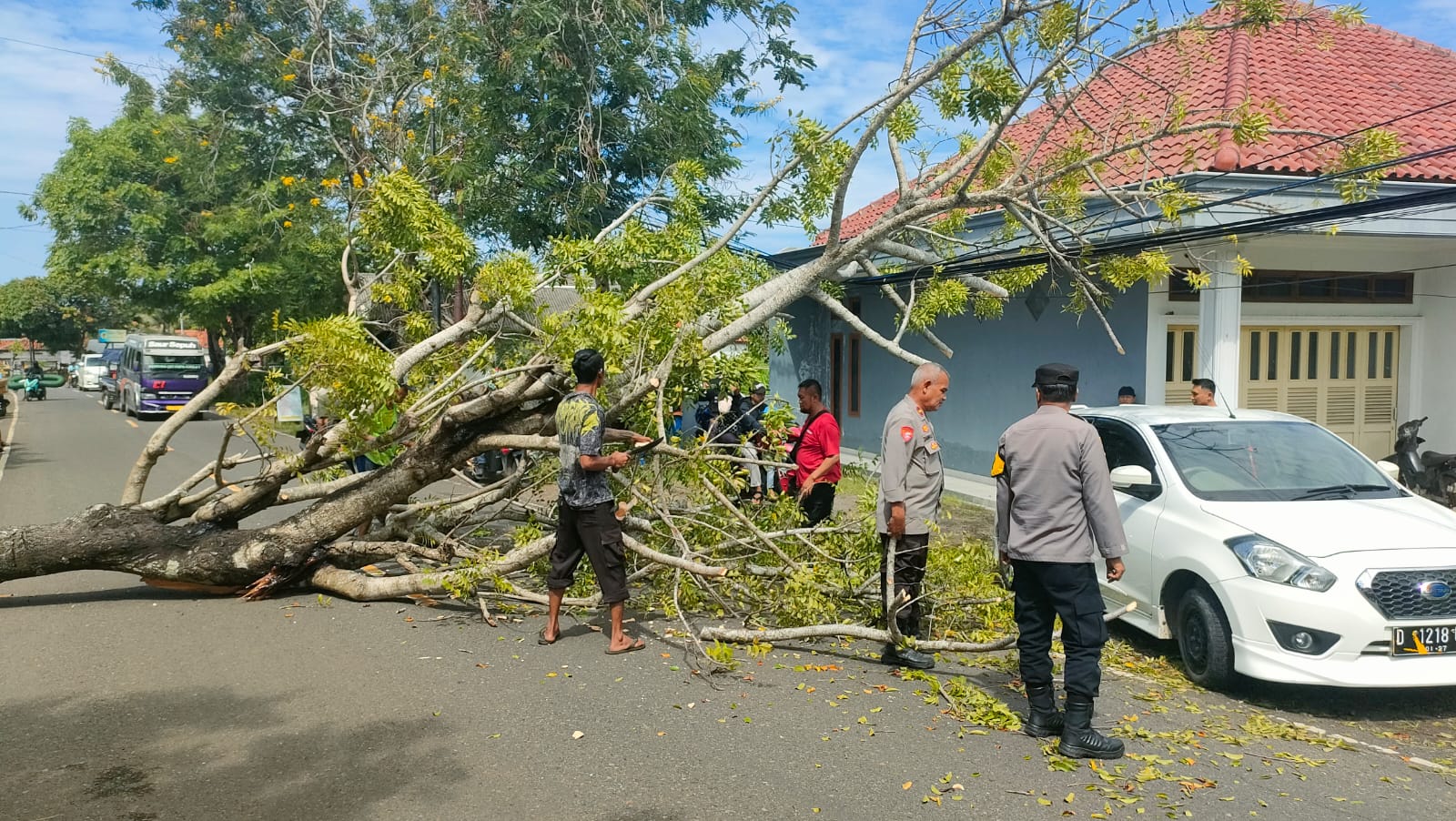 Setibanya di lokasi, petugas langsung melakukan pengaturan lalu lintas untuk mencegah kemacetan parah serta melakukan evakuasi pohon tumbang menggunakan alat potong manual.