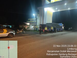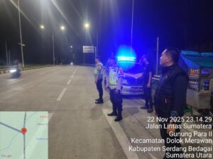 bharindo.co.id Tebing Tinggi,- Kapolsek Dolok Merawan Polres Tebing Tinggi Iptu Zuhri Zulkarnain Lubis memimpin pelaksanaan patroli penindakan dan antisipasi geng motor, balap liar dan tawuran remaja di Jalan Desa Limbong Exit Tol, Desa Naga Kesiangan Simpang Warung Bubur dan Desa Pabatu I serta Desa Panglong Kecamatan Dolok Merawan Kabupaten Sergai, Sabtu malam (22/11/2025).