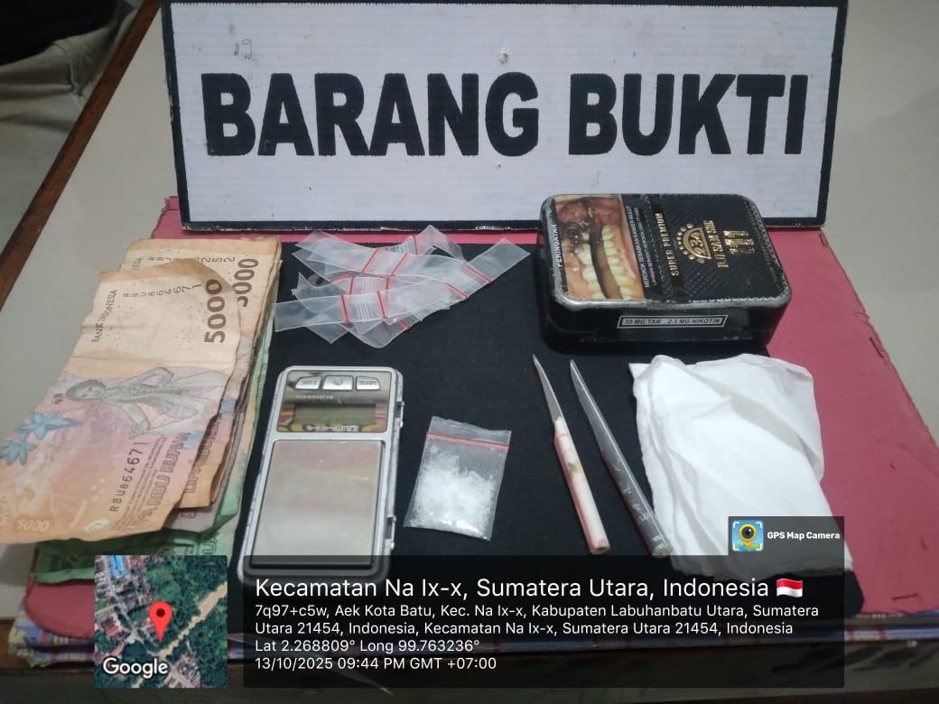 bharindo.co.id Labuhanbatu – Unit Reskrim Polsek NA IX-X Polres Labuhanbatu berhasil mengungkap kasus penyalahgunaan narkotika jenis sabu di Dusun III, Gang Nenas, Desa Simpang Merbau, Kecamatan NA IX-X, Kabupaten Labuhanbatu Utara (15/10/2025).