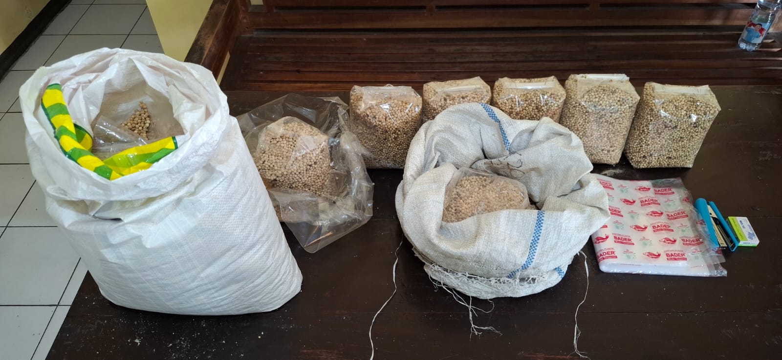 Barang bukti yang berhasil diamankan antara lain tujuh bungkus merica oplosan masing-masing seberat satu kilogram, bahan pembuat merica dari sagu seberat kurang lebih lima kilogram, satu buah stapler warna biru beserta isi, serta 37 kantong plastik merek BADER yang digunakan untuk mengemas produk tersebut.
