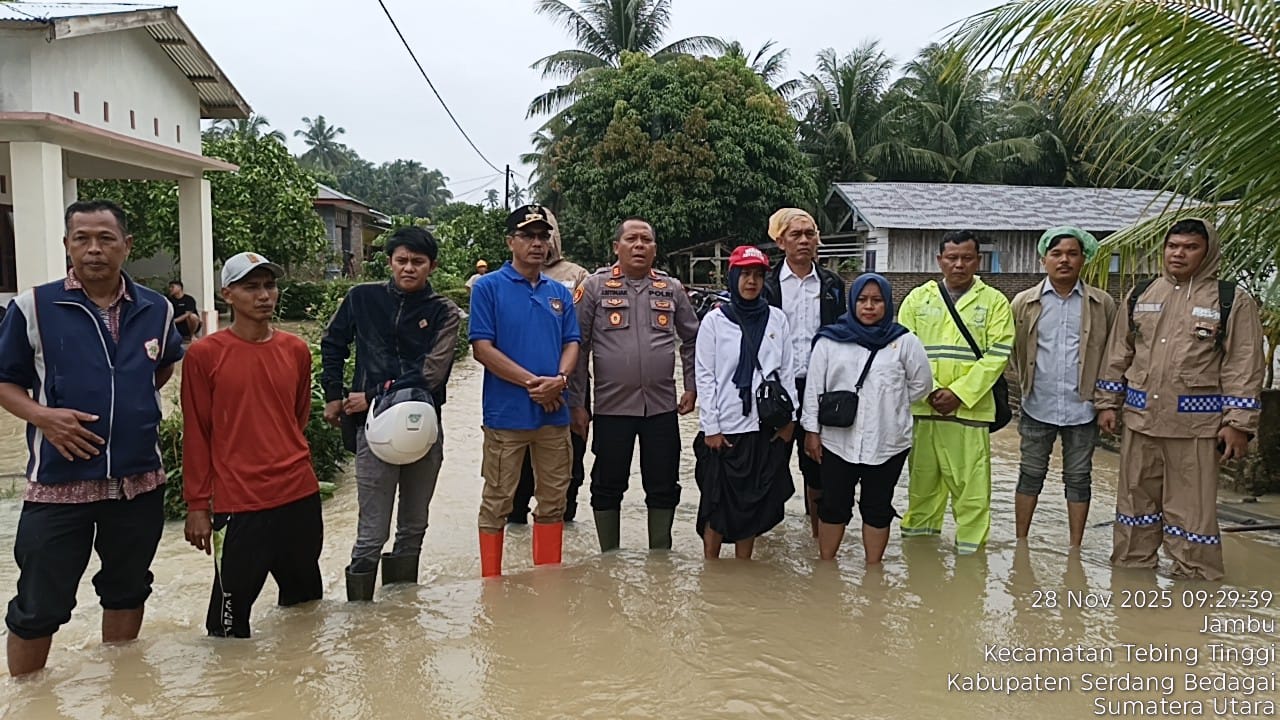 bharindo.co.id Tebing Tinggi,- Kapolsek Sipispis Polres Tebing Tinggi AKP Jaresman Sitinjak bersama Kanit Reskrim Polsek Sipispis Iptu Fernando F Sitepu, Bhabinkamtibmas Brigadir Tharmizi Purba dan personel serta Camat Sipispis Herbin Damanik memantau dan mengecek lokasi banjir di Dusun III Kampung Kambing Desa Simalas Kecamatan Sipispis Kabupaten Serdang Bedagai, Jumat (28/11/2025).