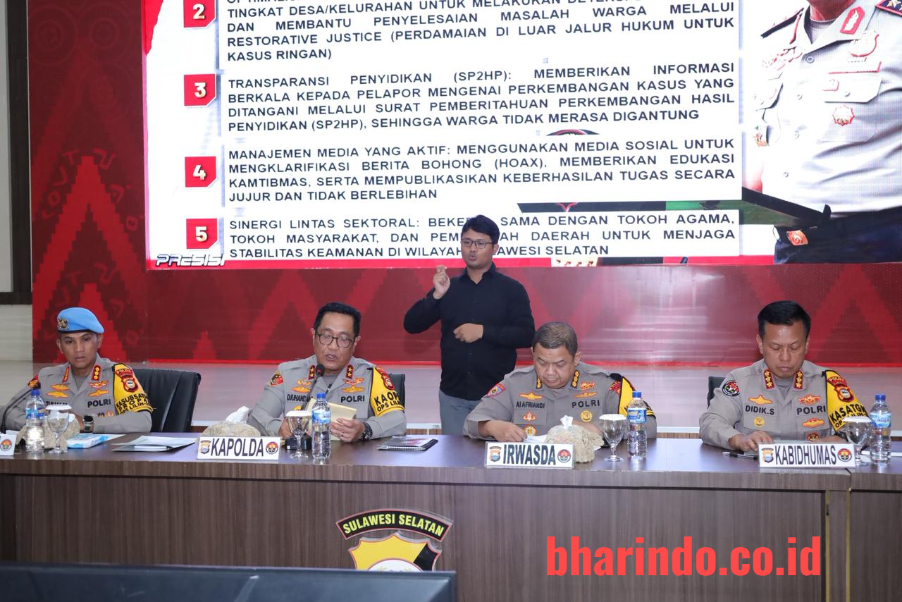 bharindo.co.id Makasar,- Polda Sulawesi Selatan menggelar Press Release Akhir Tahun 2025 sebagai bentuk transparansi dan akuntabilitas kinerja kepada publik. Kegiatan tersebut berlangsung di Aula Mappaodang Mapolda Sulawesi Selatan dan dipimpin langsung oleh Kapolda Sulawesi Selatan Irjen Pol. Djuhandhani Rahardjo Puro, S.H., M.H., Senin 29/12/2025.