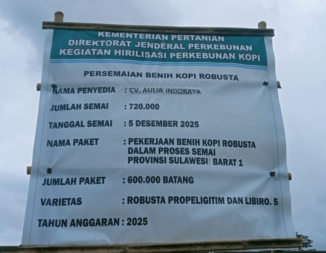 Paket pertama mencakup kegiatan persemaian benih kopi robusta sebanyak 720.000 batang yang mulai berjalan sejak 5 Desember 2025 dengan penyedia CV Aulia Indoraya.