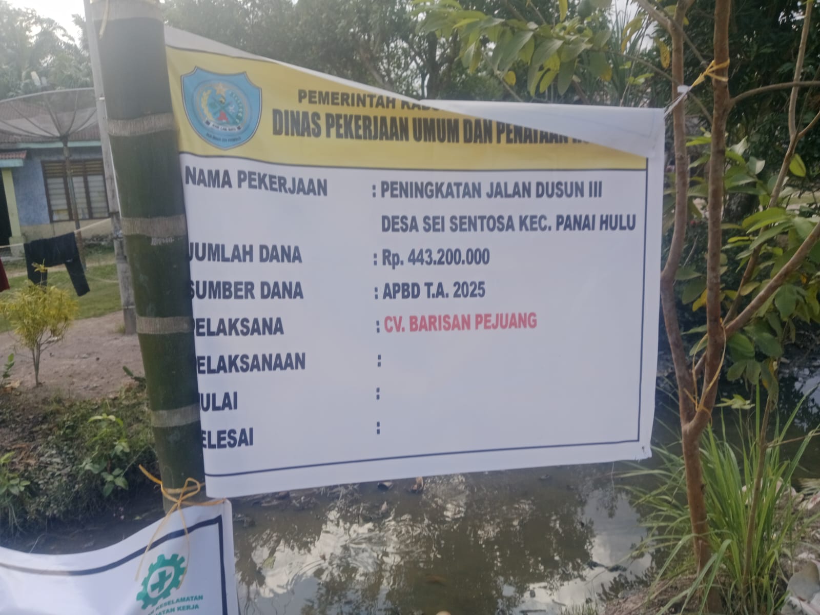 Proyek Peningkatan jalan Desa Sei Sentosa Dusun lll, hasil usulan dari wakil rakyat di DPRD, aspirasi di wujudkan melalui dana APBD untuk kelancaran roda ekonomi dan mempermudahkan aktivitas masyarakat, bahwa dana aspirasi tersebut berhasil di implementasi menjadi proyek fisik yang bermanfaat langsung di rasakan masyarakat setempat.