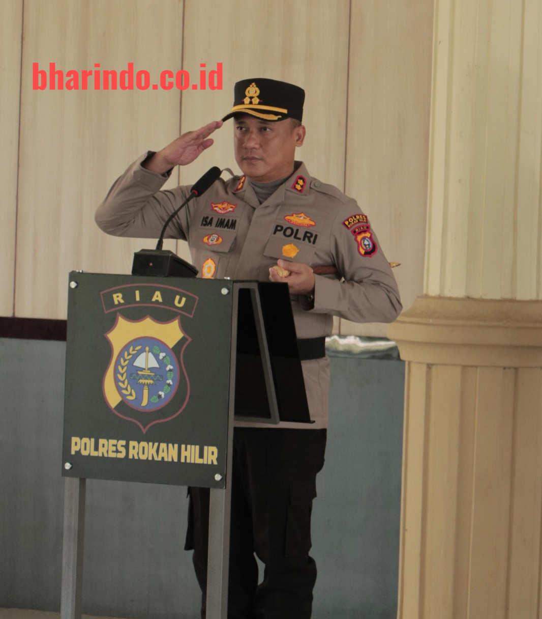 Upacara tersebut dipimpin langsung oleh Kapolres Rokan Hilir AKBP Isa Imam Syahroni, S.I.K., M.H selaku Inspektur Upacara, dengan Perwira Upacara Kompol Juliandi, S.H dan Komandan Upacara Ipda Maringan Silalahi, S.H., M.H.