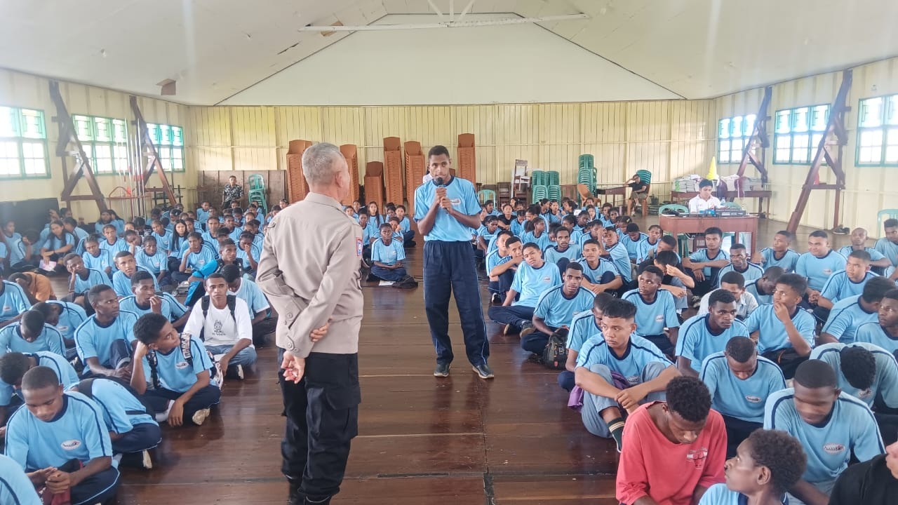 Bharindo Asmat,- Kasat Binmas Polres Asmat AKP Muhammad Ja’far, S.Sos., Bersama Banit Binpolmas Sat Binmas Brigpol Abaz Laika, Sosialisasikan Pencegahan dan Penanganan Kekerasan di Sekolah, Bertempat Di Aula SMA Katolik Yang Smith Agats, Rabu (23/7/25).
