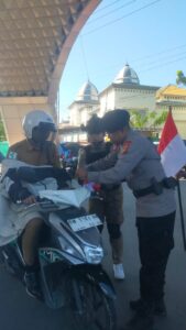 Sebanyak satu peleton anggota Satbrimob diterjunkan langsung ke lapangan untuk membagikan sekaligus memasangkan bendera merah putih di kendaraan warga yang melintas. Aksi ini menjadi pemandangan yang membangkitkan rasa bangga dan cinta tanah air di tengah masyarakat.