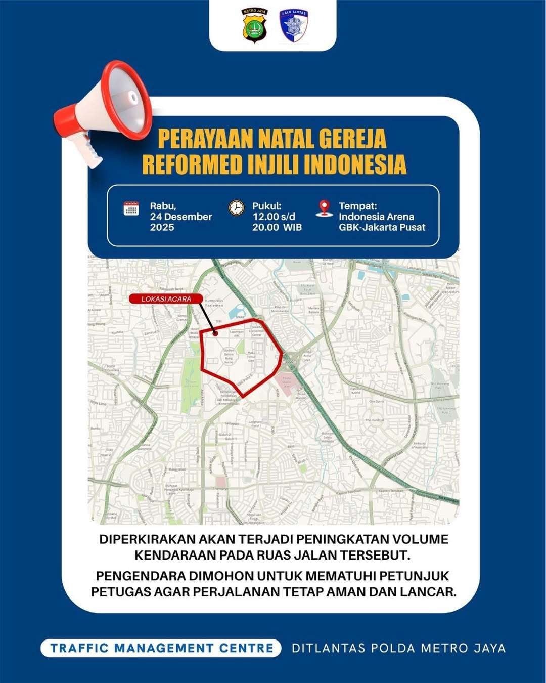 Kepadatan lalu lintas diperkirakan terjadi seiring pelaksanaan rangkaian ibadah perayaan Natal yang digelar di Indonesia Arena, GBK, mulai pukul 12.00 hingga 20.00 WIB. Aktivitas tersebut diprediksi menarik kedatangan jemaah dalam jumlah besar.