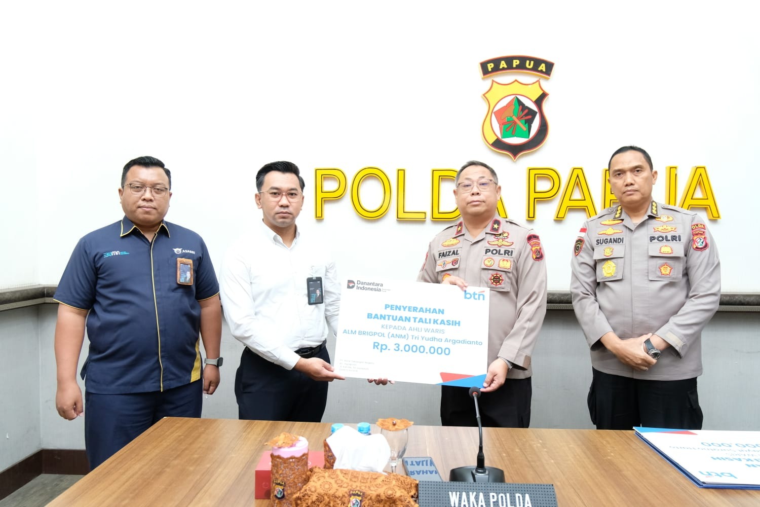 Penyerahan santunan secara simbolis dilakukan oleh perwakilan PT. Asabri kepada Wakapolda Papua, yang kemudian menyerahkannya langsung kepada keluarga almarhum personel. Mereka yang menerima santunan adalah keluarga Brigpol Anumerta Ronaldo M. Enok, korban penembakan oleh Kelompok Kriminal Bersenjata (KKB) di Kabupaten Puncak Jaya; keluarga Aiptu Anumerta Hidayat Suratno Harto, korban pembacokan di sebuah warung di Kabupaten Lanny Jaya; dan keluarga Brigpol Anumerta Tri Yudha Argadianto, yang juga menjadi korban pembacokan di daerah yang sama.